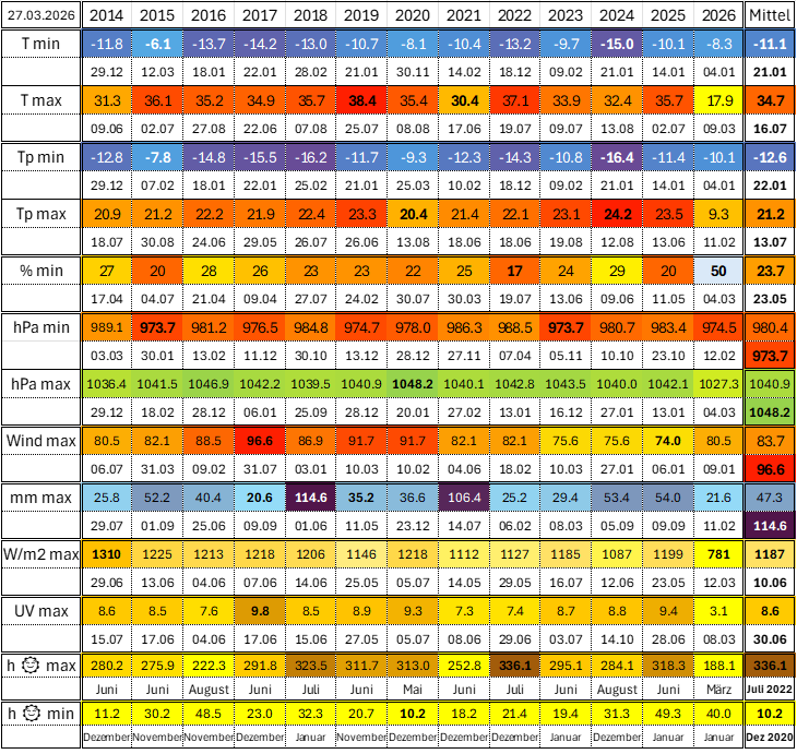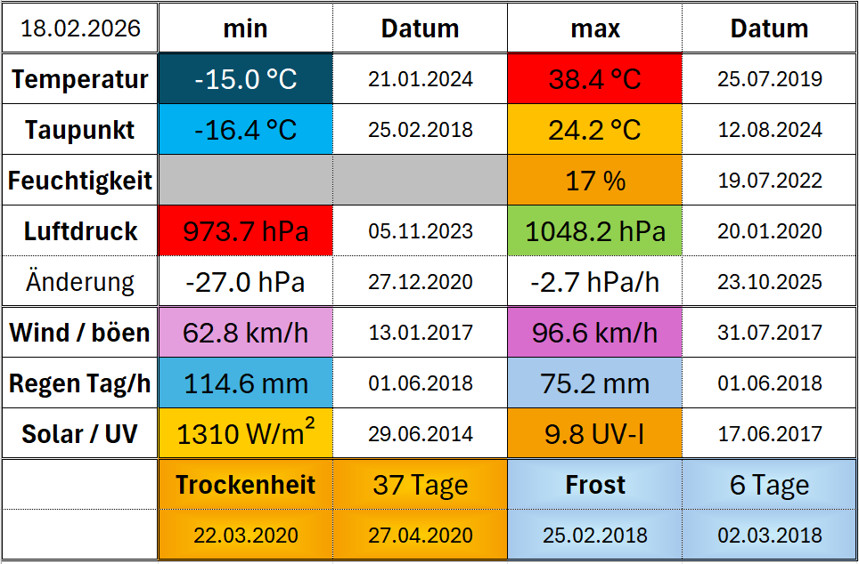 | Rekorde der Wetterstation seit Aufzeichnungsbeginn (01.01.2014) |