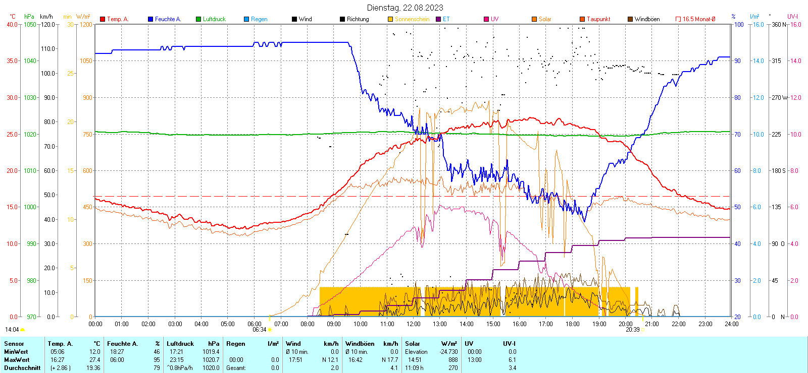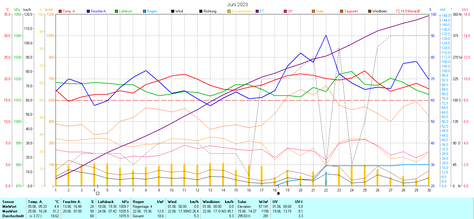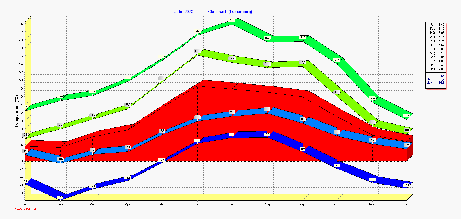 Graphik der absoluten und durchschnittlichen Höchst- und Tiefsttemperaturen des jeweiligen Monats | Klimadiagramm des laufenden Jahres |