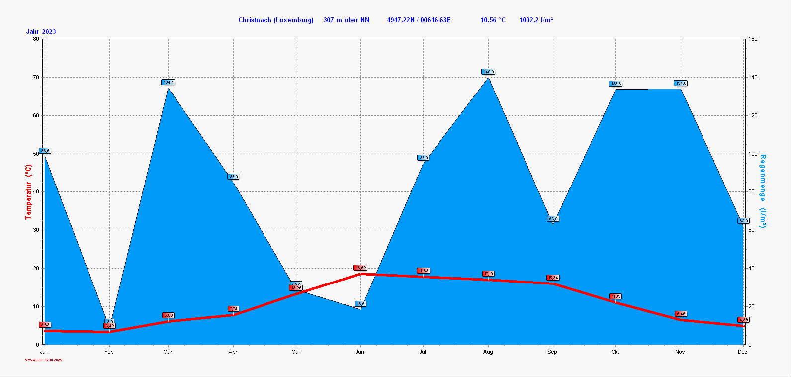Lage und Höhe der Station: 49°47'13"N / 6°16'38"E / 307 m |