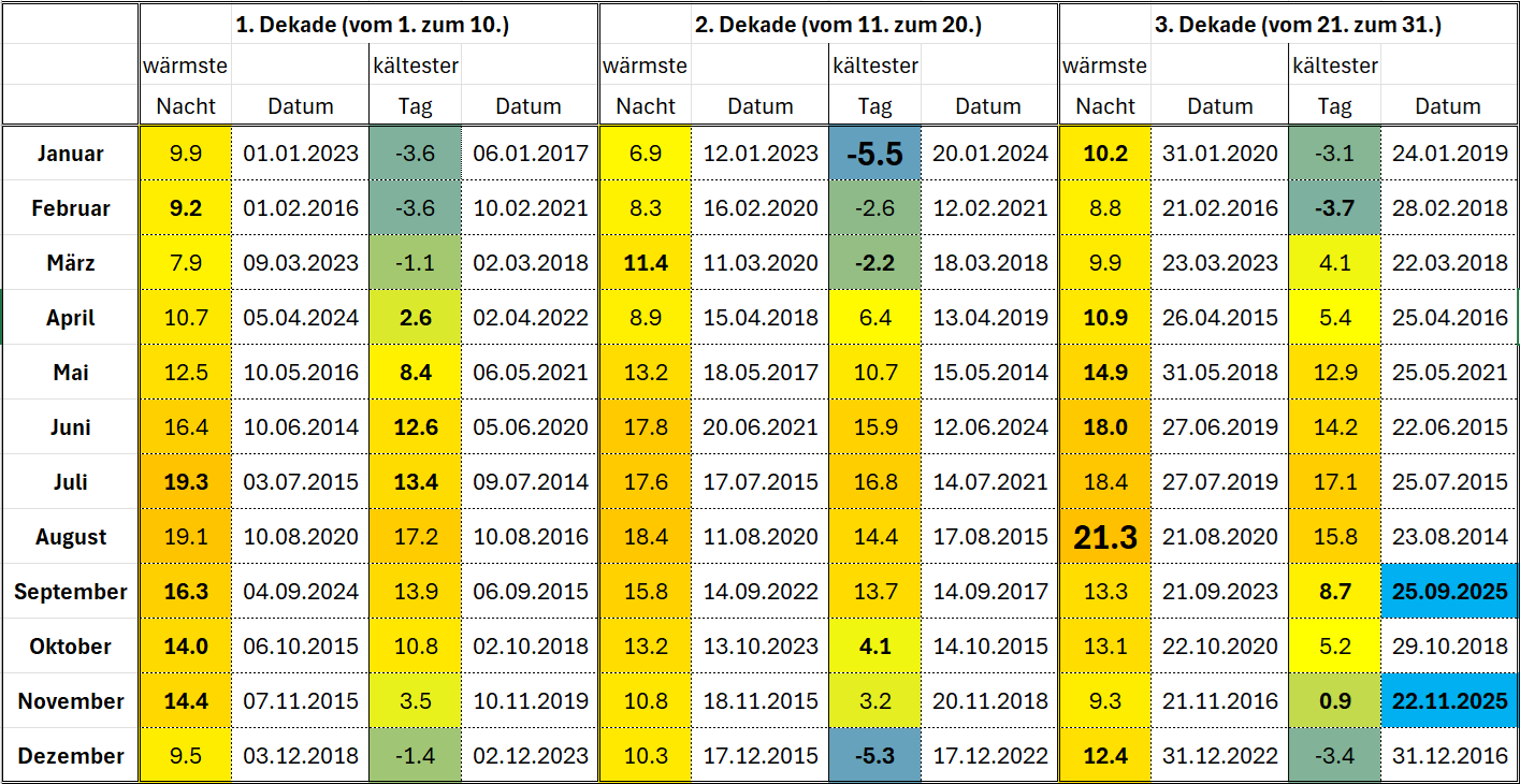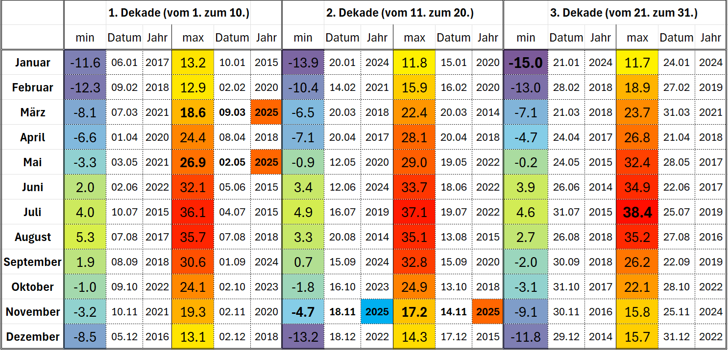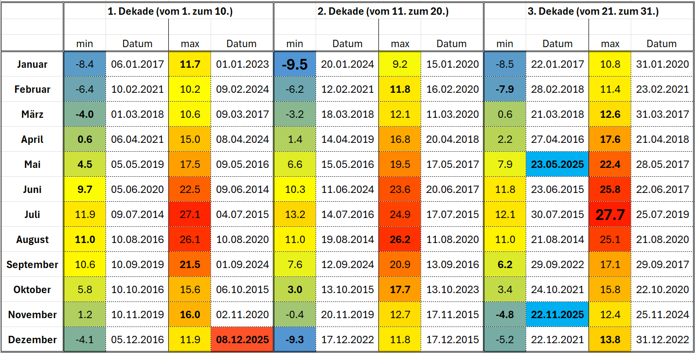 | Dekadenrekorde Extremwerte Temperatur seit Aufzeichnungsbeginn (01.01.2014) |